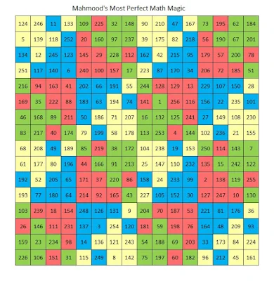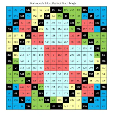 This is 12x12 Double Math Magic which includes 288 boxes, in which numbers are in sequence from 1 to 288. The sum of twelve numbers in each color is 1734 and the total value of 288 boxes is 41616.